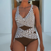 SPESIFIKASJONER Stil: Ferie Materiale: 15% Spandex,85% Polyester Anledning: Ferie Halslinje: Halter Mønstertype: Prikk,Fargeblokk Erme lengde: Ermeløs Topp type: Tankini BH type: Bøyle-fri BH Truse type: Shorts Passform type: Skinny Årstid: Sommer Detaljer: Lappeverk,Knyt side Pakken inkluderer: 1 x Tankini STØRRELSESTABELL (cm) Størrelse Br...