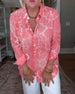 En fargerik fritidsbluse med blomstertrykk med V-hals og trekvart erme