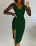SPESIFIKASJONER Kjole type: Omslags Kjolens lengde: Knelengde Stil: Fest, Sexy Materiale: Melk Silke, Polyester Anledning: Natt ute Halslinje: V-hals Mønstertype: Paljett, Ensfarget Ermetype: Pufferme Erme lengde: Langermet Passform type: Skinny Årstid: Sommer Detaljer: Lappeverk, Spalte Pakken inkluderer: 1 x Kjole STØRRELSESTABELL (cm) ...