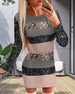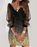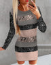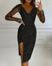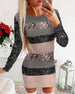 SPESIFIKASJONER Stil: Elegant, Elegant Materiale: Mesh, Paljetter, Polyester Kjole type: Bodycon Kjolens lengde: Knelengde Halslinje: V-hals Mønstertype: Paljett Ermetype: Vanlig erme Erme lengde: Langermet Detaljer: Gjennomsiktig Passform type: Skinny Årstid: Vår, Sommer Anledning: Ferie, Parti Pakken inkluderer: 1 x Kjole STØRRELSESTABEL...