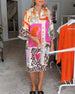 Løs printet kjole med V-hals klokkeerme og patchwork