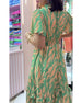 Lang kjole med V-hals i trykk med korte ermer