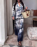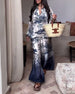 SPESIFIKASJONER Stil: Uformelt Kategori: Sett Materiale: Bomullsblandinger Mønstertype: Trykt Halslinje: V-hals Ermetype: Lanterne erme Erme lengde: Langermet Bukse type: Bredt ben Bukselengde: Lang Midje type: Midt i midjen Passform type: Vanlig Årstid: Vår,Sommer,Høst Anledning: Daglig Pakken inkluderer: 1 x Topp, 1 x Bukser STØRRELSESTABELL...