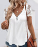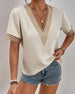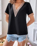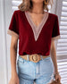 SPESIFIKASJONER Topp type: Bluser Stil: Uformelt Anledning: Daglig Halslinje: V-hals Mønstertype: Ensfarget Ermetype: Vanlig erme Erme lengde: Kort erme Passform type: Vanlig Årstid: Sommer Materiale: Polyester Detaljer: Lappeverk, Glidelås, Blonder Pakken inkluderer: 1 x Bluse STØRRELSESTABELL (cm) Størrelse Bryst Lengde S 92 64...
