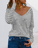 SPESIFIKASJONER Topp type: T skjorte Stil: Uformelt Halslinje: V-hals Erme lengde: Langermet Ermetype: Vanlig erme Passform type: Løs Mønstertype: Stripete, Ensfarget Materiale: Bomullsblandinger Anledning: Daglig Årstid: Høst Pakken inkluderer: 1 x T-skjorte STØRRELSESTABELL (CM) Størrelse Brystvidde Ermelengde Skuldervidde Lengde ...