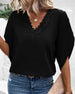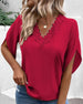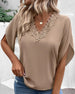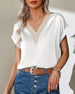 SPESIFIKASJONER Topp type: T skjorte Stil: Elegant Anledning: Daglig Halslinje: V-hals Mønstertype: Ensfarget Ermetype: Vanlig erme Erme lengde: Kort erme Passform type: Vanlig Årstid: Vår, Sommer, Høst Materiale: Polyester Detaljer: Lappeverk, Blonder Pakken inkluderer: 1 x T-skjorte STØRRELSESTABELL (cm) Størrelse Bryst Lengde A...