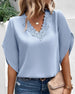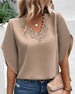 SPESIFIKASJONER Topp type: Bluser Stil: Elegant, Forretning Materiale: Melk Silke, Spandex, Polyester Anledning: Daglig, Arbeid Halslinje: V-hals Mønstertype: Ensfarget Ermetype: Utvidet erme Erme lengde: Kort erme Passform type: Vanlig Årstid: Vår, Sommer, Høst Detaljer: Lappeverk, Blonder Pakken inkluderer: 1 x Bluse STØRRELSESTABELL (cm)...