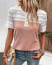 SPESIFIKASJONER Topp type: Bluser Stil: Elegant Materiale: Bomullsblandinger Anledning: Daglig Halslinje: Rund hals Mønstertype: Fargeblokk Ermetype: Vanlig erme Erme lengde: Kort erme Passform type: Vanlig Årstid: Vår, Sommer, Høst Detaljer: Lappeverk, Knapper, Blonder Pakken inkluderer: 1 x Bluse STØRRELSESTABELL (cm) Størrelse B...