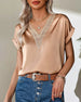 SPESIFIKASJONER Topp type: Bluser Stil: Elegant, Forretning Materiale: Spandex, Satin Anledning: Daglig, Arbeid Halslinje: V-hals Mønstertype: Ensfarget Ermetype: Vanlig erme Erme lengde: Kort erme Passform type: Løs Årstid: Vår, Sommer, Høst Detaljer: Lappeverk, Blonder Pakken inkluderer: 1 x Bluse STØRRELSESTABELL (cm) Størrels...