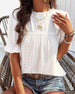 SPESIFIKASJONER Topp type: Topper Stil: Elegant Materiale: Bomull, Polyester Anledning: Daglig Halslinje: Rund hals Mønstertype: Ensfarget Ermetype: Volanger erme Erme lengde: Kort erme Passform type: Vanlig Årstid: Vår, Sommer, Høst Detaljer: Lappeverk Pakken inkluderer: 1 x Topp STØRRELSESTABELL (cm) Størrelse Bryst Lengd...