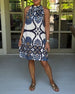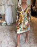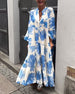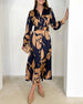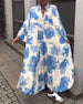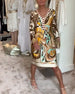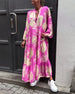 Løs printet kjole med V-hals klokkeerme og patchwork