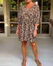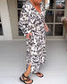 SPESIFIKASJONER Stil: Uformelt Materiale: Bomullsblandinger Kjole type: Rett Kjole Kjolens lengde: Over kneet Halslinje: V-hals Mønstertype: Leopard Ermetype: Flaggermus erme Erme lengde: 3/4 erme Passform type: Løs Årstid: Vår, Sommer, Høst Anledning: Daglig Pakken inkluderer: 1 x Kjole STØRRELSESTABELL (cm) Størrelse Bryst Lengde...
