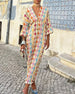 SPESIFIKASJONER Stil: Ferie,Elegant Materiale: Bomullsblandinger Kjole type: A-line Kjolens lengde: Maxi Halslinje: V-hals Mønstertype: Geometrisk trykk Ermetype: Lanterne erme Erme lengde: 3/4 erme Detaljer: Lappeverk,Ryggløs Passform type: Løs Årstid: Vår,Sommer,Høst Anledning: Daglig,Ferie Pakken inkluderer: 1 x Kjole STØRRELSESTABELL (cm) ...